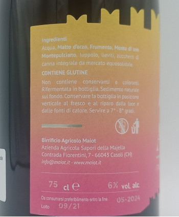 Ingredients: Water, barley malt, wheat, Montepulciano grape must, hops, yeasts, whole cane sugar from fair trade.
