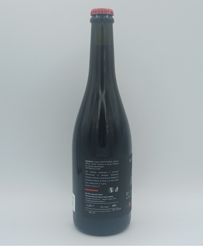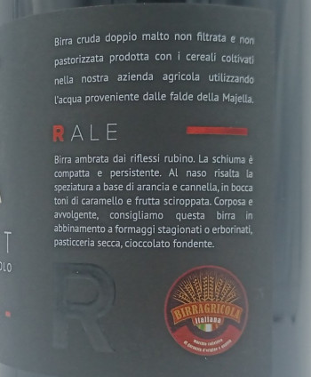 Unfiltered and unpasteurized double malt raw beer amber with ruby ​​reflections with compact and persistent foam.
